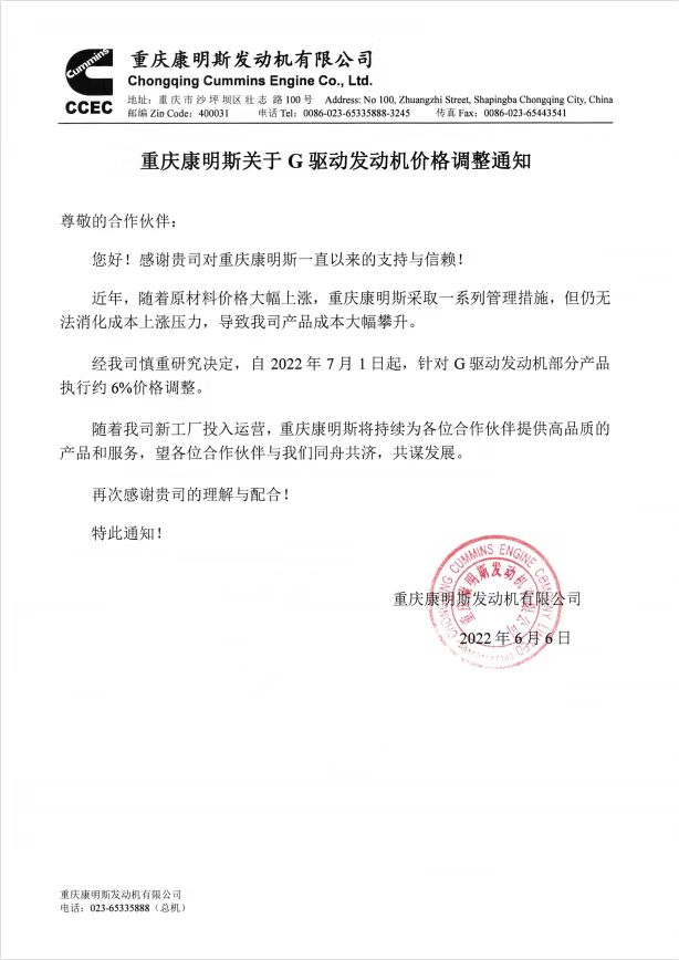 優(yōu)凱動力專業(yè)生產(chǎn)柴油發(fā)電機組,作為重慶康明斯發(fā)動機的OEM廠家,近日收到其發(fā)動機價格調(diào)整通知,通知如下: