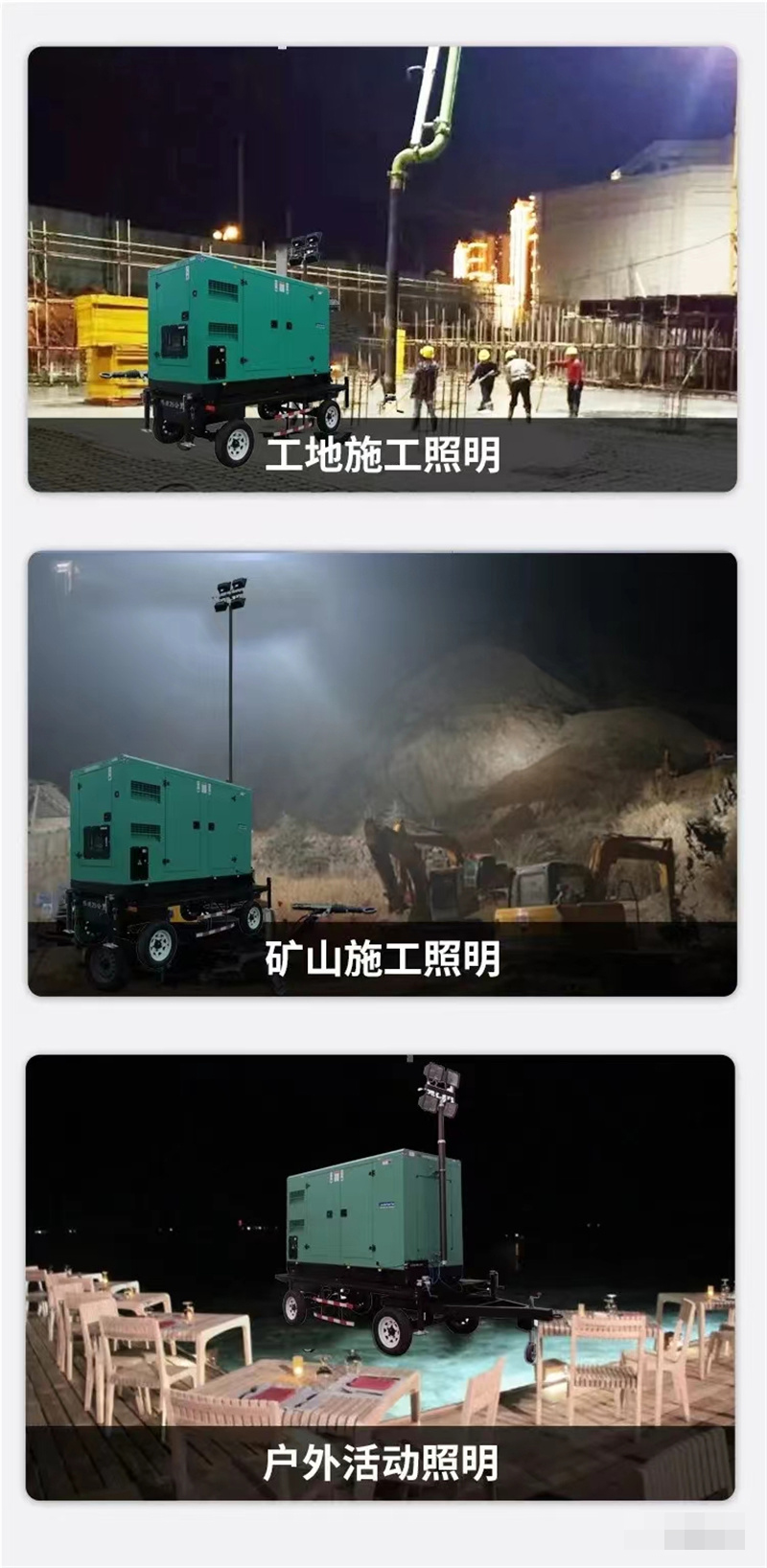 各種夜間作業(yè)如大型施工、工程搶修、災(zāi)情搶險、消防照明、警案現(xiàn)場、交通拯救、事故處理和廣告拍攝等場合,滿足了現(xiàn)場對大面積、高亮度照明的需求。
