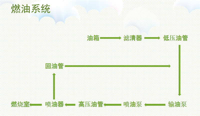 組成: 燃油供給系統(tǒng)由噴油泵、調(diào)速器、輸油泵、燃油濾清器、噴油器、高壓油管、低壓油管及其附件。