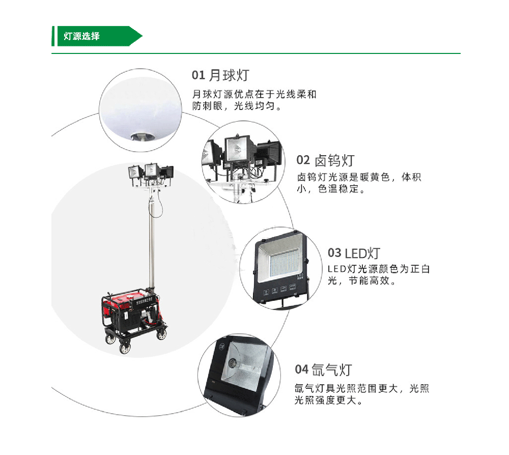 照明:也可將燈頭在燈盤上均布向四個(gè)不同方向照明,如需四個(gè)燈頭向同一方向照明,則可按所需照明角度和方位將燈盤整體向開口方向在250°內(nèi)翻轉(zhuǎn)及以氣缸為軸心向左右進(jìn)行360°旋轉(zhuǎn);整體照明遠(yuǎn)近兼顧,照明亮度高、范圍大,飛利浦燈泡壽命長(zhǎng)。3、升降性能:遙控自動(dòng)升降。選用4節(jié)伸縮氣缸作為升降調(diào)節(jié)方式,最大高度為4.5米,燈光覆蓋半徑達(dá)到35-55米。4、工作時(shí)間:使用發(fā)電機(jī)組供電時(shí),一次注滿燃油可連續(xù)工作8小時(shí)以上,使用220V市電可長(zhǎng)時(shí)間照明。5、操作方便:通過(guò)無(wú)線遙控可在50米范圍內(nèi)分別控制每組的開啟和關(guān)閉并可遙控升降桿的升起和降落。6、燈盤、汽缸和發(fā)電機(jī)組為整體結(jié)構(gòu),發(fā)電機(jī)組底部裝有萬(wàn)向輪,可在坑洼的路面及鐵軌上運(yùn)行。整體采用優(yōu)質(zhì)進(jìn)口金屬材料制作,結(jié)構(gòu)緊湊,性能穩(wěn)定,可確保在各種惡劣環(huán)境和氣候條件下正常工作。7、可定制性:為滿足客戶個(gè)性化的需求,本產(chǎn)品的標(biāo)準(zhǔn)配置不能滿足用戶的工作需要,我們可在燈頭數(shù)量、功率、泛光或聚光、伸縮氣桿升起高度及發(fā)電機(jī)的裝備按您的要求作調(diào)整。 適用范圍