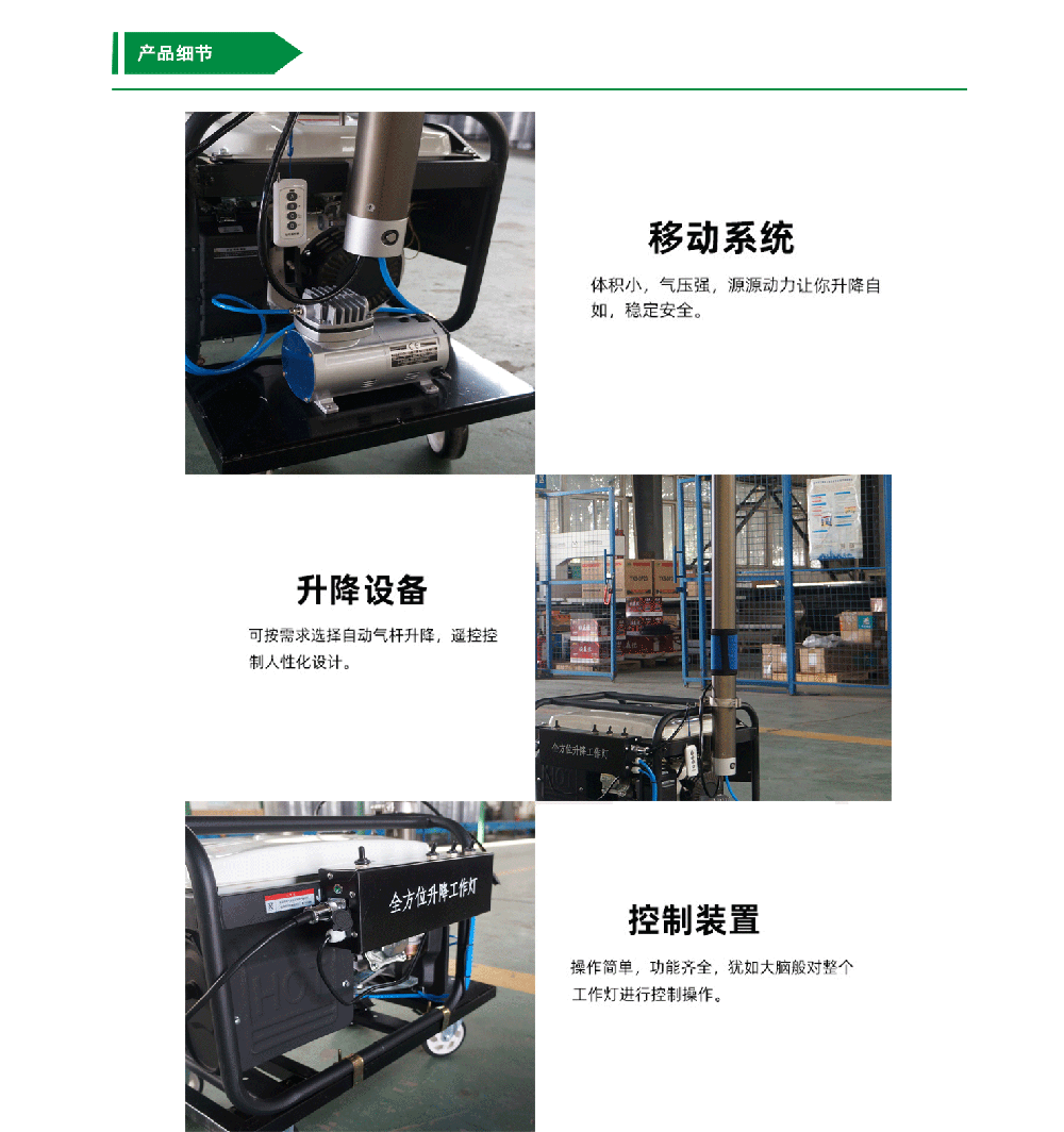 整套設(shè)備結(jié)構(gòu)合理、操作方便,自帶發(fā)電機(jī),自動(dòng)升降,外表精細(xì)、升降平穩(wěn),啟動(dòng)快,在緊急情況下可以隨時(shí)點(diǎn)亮燈具,實(shí)現(xiàn)照明。